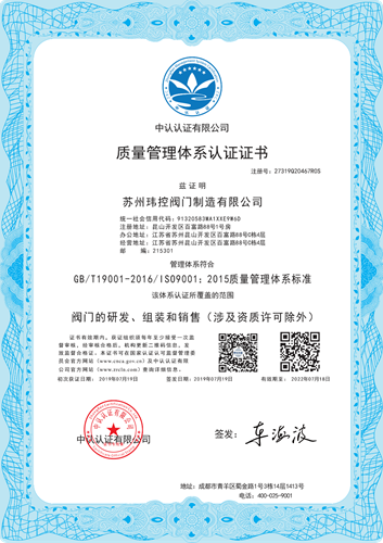 公司高層得力領(lǐng)導(dǎo)及各部門積極配合下,經(jīng)過(guò)中認(rèn)認(rèn)證公司專家的全面、嚴(yán)格、細(xì)致的指導(dǎo)和審核,確認(rèn)我公司質(zhì)量管理體系符合ISO9001:2015質(zhì)量體系標(biāo)準(zhǔn)的要求,昆山立信隆流體附屬公司蘇州瑋控閥門制造有限公司的閥門的研發(fā)、組裝和銷售以及一 些特殊行業(yè)定制產(chǎn)品的設(shè)計(jì)與制造過(guò)程中均能嚴(yán)格按照ISO9001:2015的標(biāo)準(zhǔn)執(zhí)行。